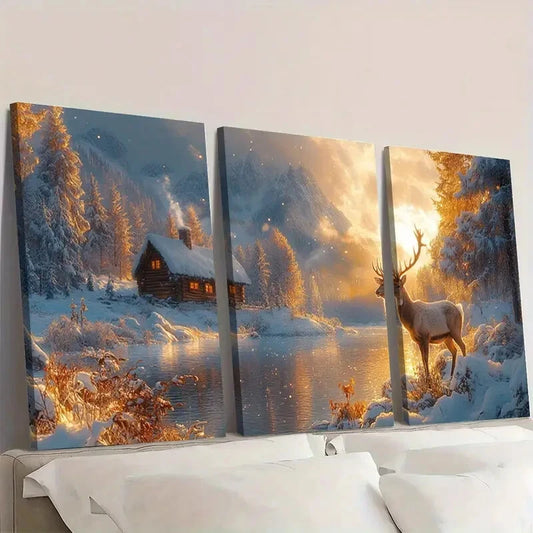 3pcs Landscape with Cozy Cabin & Majestic Stag Wall Art Set Canvas Framed 40x60cm - High Quality Print 100% Australian Made Wall Canvas Ready to Hang