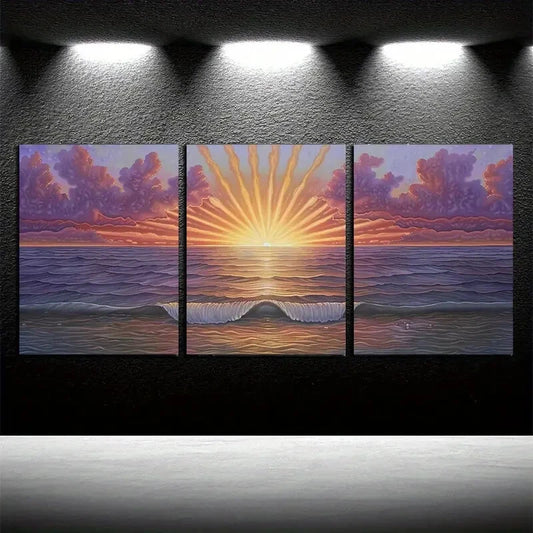 3pcs Vibrant Ocean Wave with Sunrise Illustration Metal Print Ready to Hang Art
