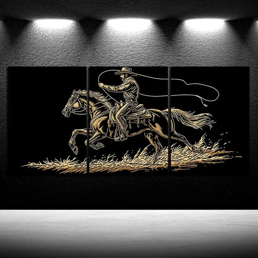 3pcs Stunning Golden Horse Riding Metal Print Ready to Hang Art