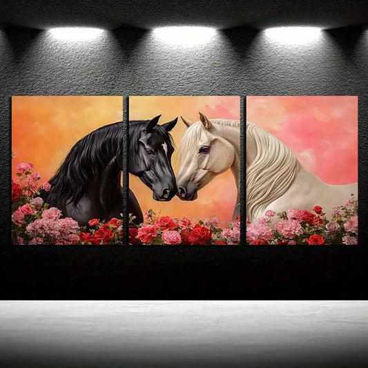 3pcs Vibrant Two horses love with Florals Design Metal Print Ready to Hang Art