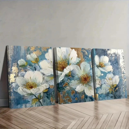 3pcs White Flowers With Blue Accents Wall Art Set Canvas Framed 60x90cm - High Quality Print 100% Australian Made Wall Canvas Ready to Hang