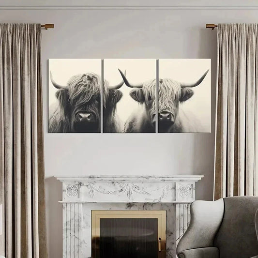 3pcs Highland Cattle Vintage Painting Wall Art Set Canvas Framed 40x60cm - High Quality Print 100% Australian Made Wall Canvas Ready to Hang