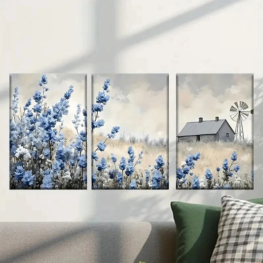 3pcs Farmhouse with Vibrant Blue Flowers Wall Art Set Canvas Framed 40x60cm - High Quality Print 100% Australian Made Wall Canvas Ready to Hang