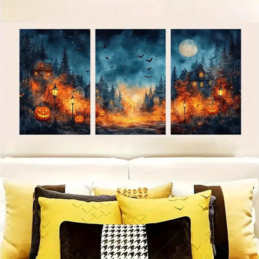 3pcs Halloween Lamp Bat and House Scenery Metal Print Ready to Hang Art