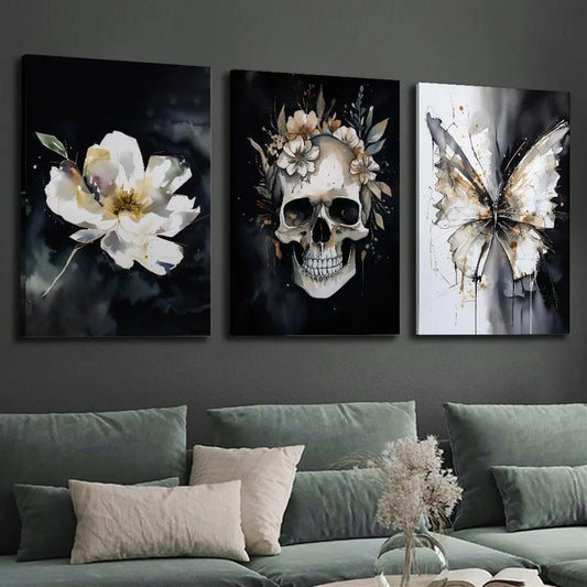 3pcs Watercolor dark, Botanical flowers, skulls, butterflies Metal Print Ready to Hang Art