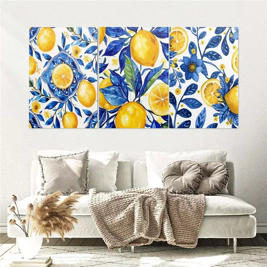 3pcs Blue Yellow Lemon Painting Wall Art Set Canvas Framed 60x90cm - High Quality Print 100% Australian Made Wall Canvas Ready to Hang