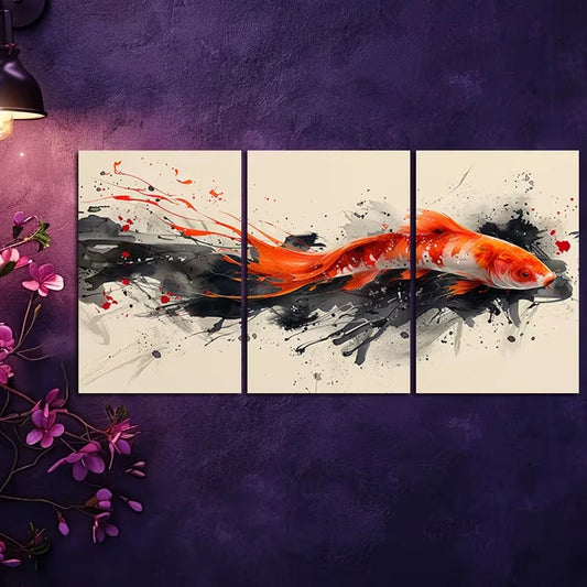 3pcs Koi Fish in Black & Orange Ink Splashes Wall Art Set Canvas Framed 60x90cm - High Quality Print 100% Australian Made Wall Canvas Ready to Hang