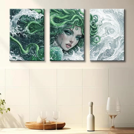 3pcs Green Beautiful Medusa Wall Art Set Canvas Framed 60x90cm - High Quality Print 100% Australian Made Wall Canvas Ready to Hang
