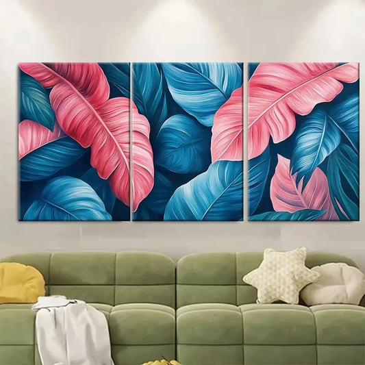 3pcs Bright Pink Blue Teal Exotic Leaves Wall Art Set Canvas Framed 60x90cm - High Quality Print 100% Australian Made Wall Canvas Ready to Hang