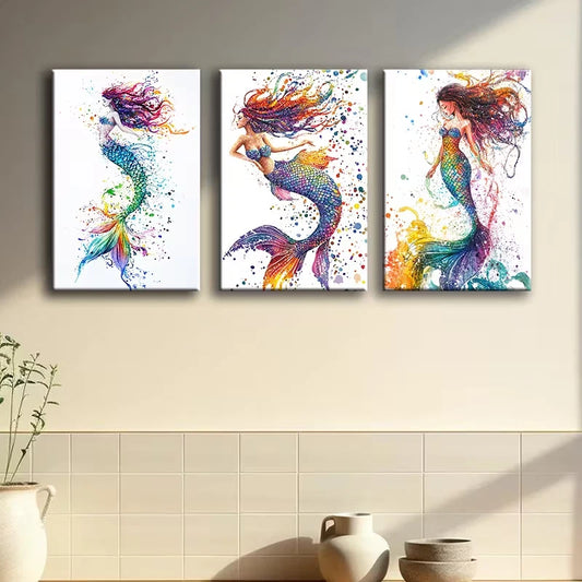 3pcs Vibrant Mermaid Watercolor Wall Art Set Canvas Framed 60x90cm - High Quality Print 100% Australian Made Wall Canvas Ready to Hang