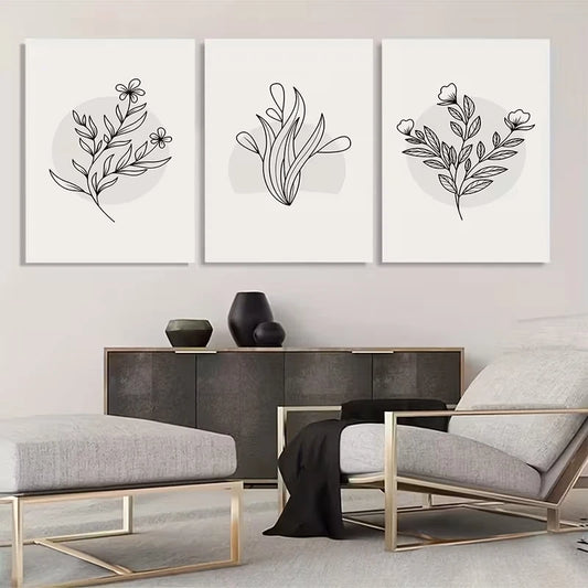 3pcs Minimalist Gray Botanical line drawings Wall Art Set Canvas Framed 60x90cm - High Quality Print 100% Australian Made Wall Canvas Ready to Hang