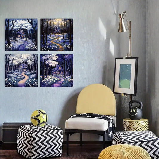 4pcs Night Forest Floral Cottage Picture CP Wall Art Canvas Framed