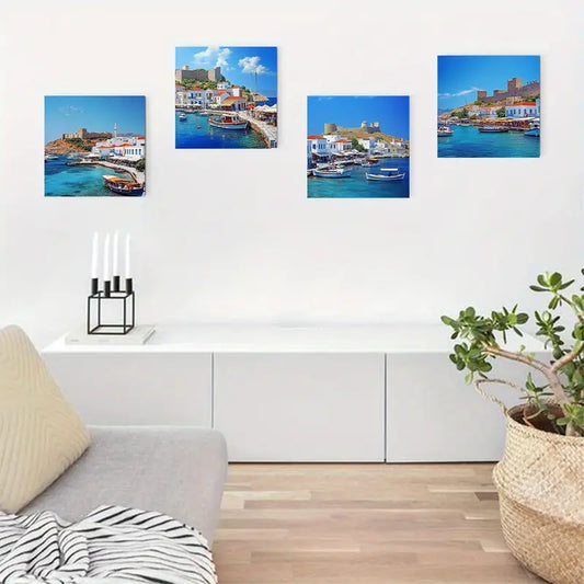 4pcs Greek Shoreline Scenery With Blue Waters Wall Art Canvas Framed