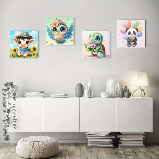 4pcs Cow, Owl, Turtle & Panda, Vibrant Wall Art Canvas Framed