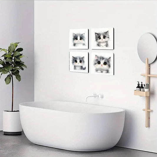 4pcs Adorable Gray & White Kitten Wall Art Canvas Framed