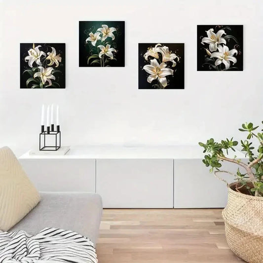 4pcs Elegant White Lilies & Golden Swirls Wall Art Canvas Framed
