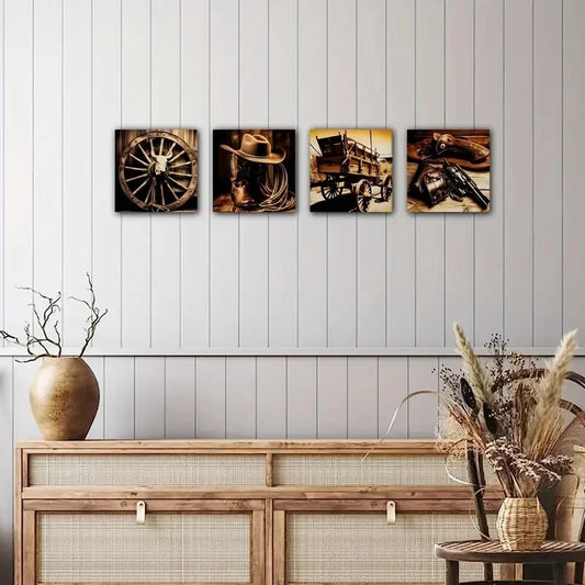 4pcs Cowboy Hat Boot Saddle Faux Leather Rancher Wall Art Canvas Framed