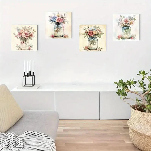 4pcsRustic Floral Bouquet In Vase Wall Art Canvas Framed