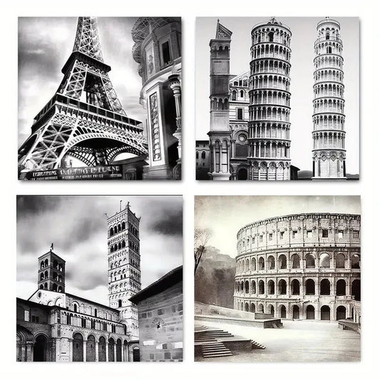 4pcsVintage Black And White European Landmark Wall Art Canvas Framed