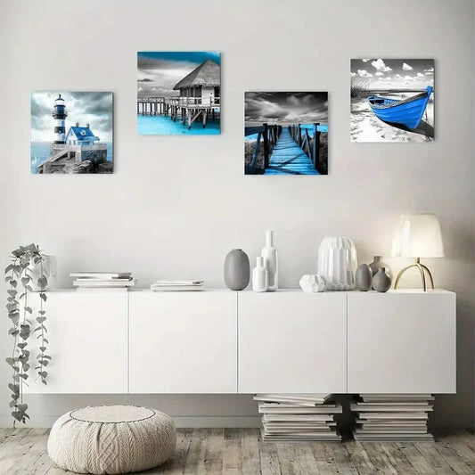 4pcs Blue Beach Coastal Black And White Lighth Wall Art Canvas Framed