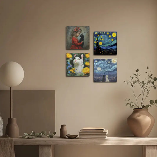 4pcs Cute Cat Decoration Orange Cat Ornament Wall Art Canvas Framed