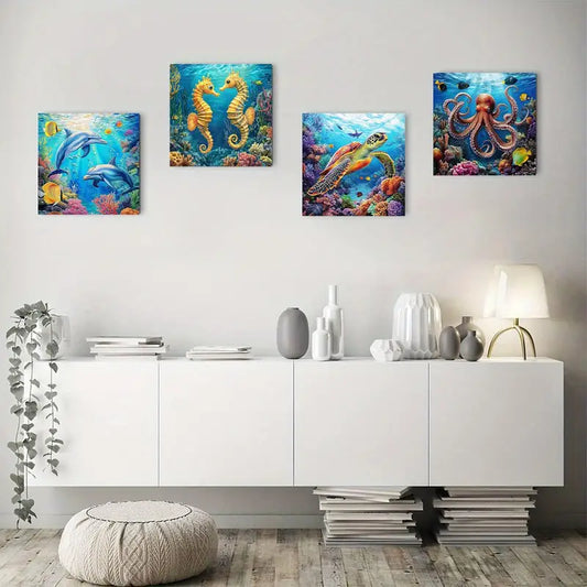 4pcsAnimal Seahorse Turtle Octopuses DolphinsWall Art Canvas Framed