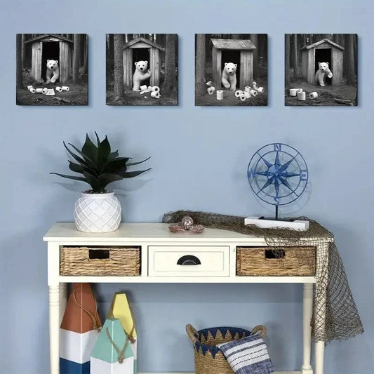 4pcsVintage Abstract Black & White Bear Wall Art Canvas Framed