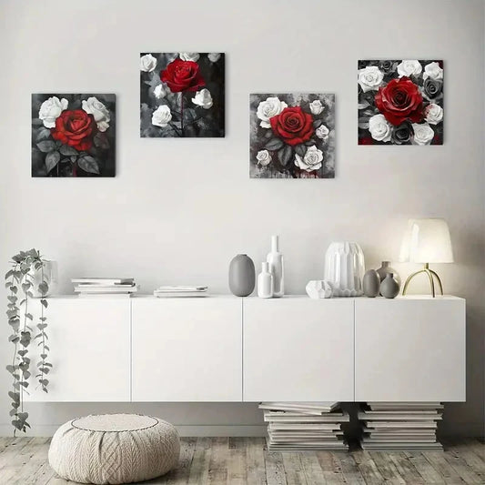4pcsWhite And Black Red Rose Wall Art Canvas Framed