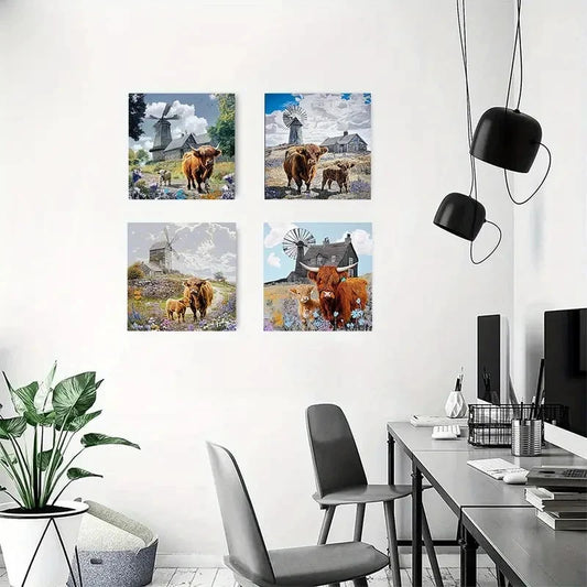 4pcsVintage Farmhouse HighlandWall Art Canvas Framed