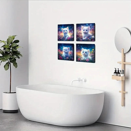 4pcs Flower White Cat Poster Fun Cat Wall Art Canvas Framed