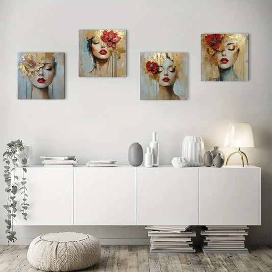 4pcs Fashion Floral Crown Woman Wall Art Canvas Framed