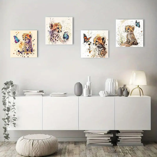 4pcs Cheetah With A Butterfly Wall Art Canvas Framed