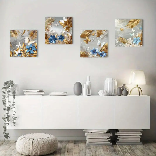 4pcs Elegant Golden Leaves & Butterflies, Wall Art Canvas Framed