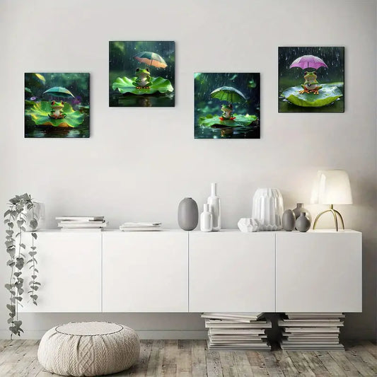 4pcs Whimsical Frog & For Lotus Leaf Wall Art Canvas Framed