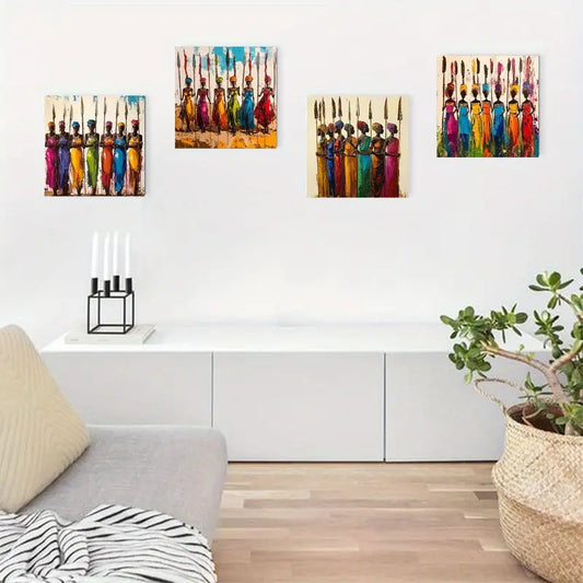 4pcs Traditional Attire & Spear Motifs, Cultural Wall Art Canvas Framed
