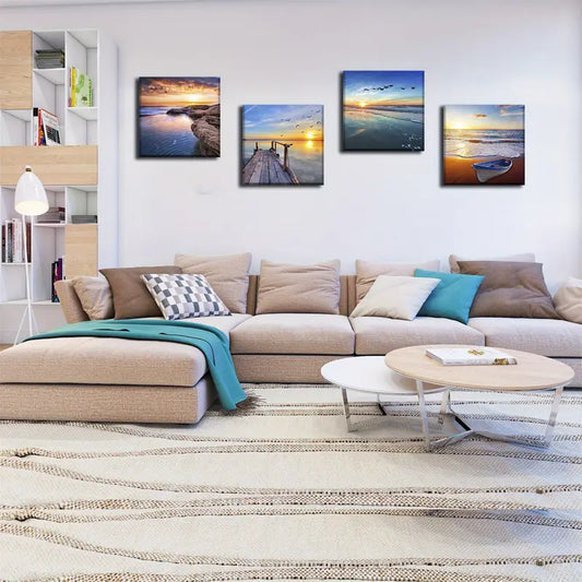 4pcs Sunset Seaside Landscape Painting Wall Art Canvas Framed