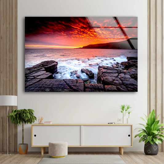 Sea with Rocks Sunset Scenery Photograph Acrylic Glass Print Tempered Glass Wall Art 100% Made in Australia Ready to Hang