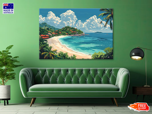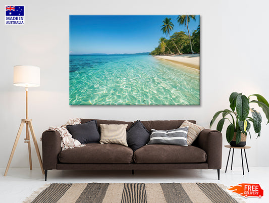 A Beach with a Body of Water with Palm Trees & a Sky Print 100% Australian Made