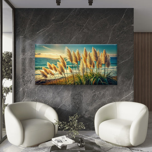Pampas Grass Swaying Sea Wall Art Canvas Office Home Room Framed 120x60cm
