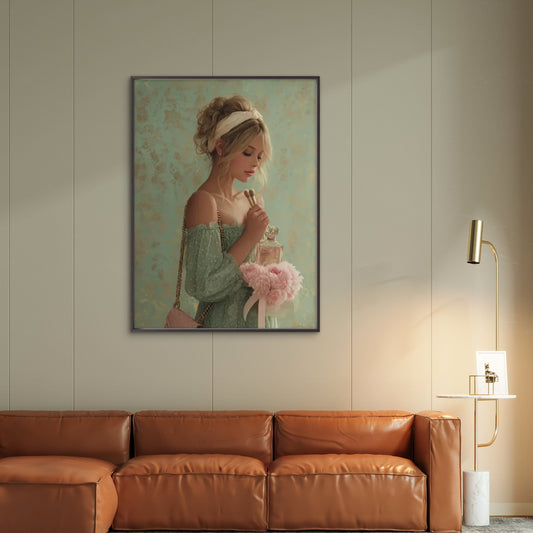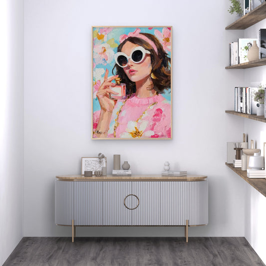 Retro Pink Floral Woman with Vintage Perfume Bottle Fashion Home Decor Premium Quality Poster Print Choose Your Sizes
