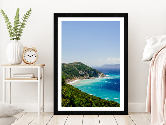 Blue Aegean Sea Coast &Wild Cliff Glass Framed Wall Art, Ready to Hang Quality Print