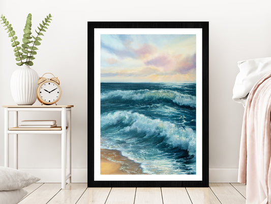 Ocean Beach Waves Watercolor Oil Painting Glass Framed Wall Art, Ready to Hang Quality Print