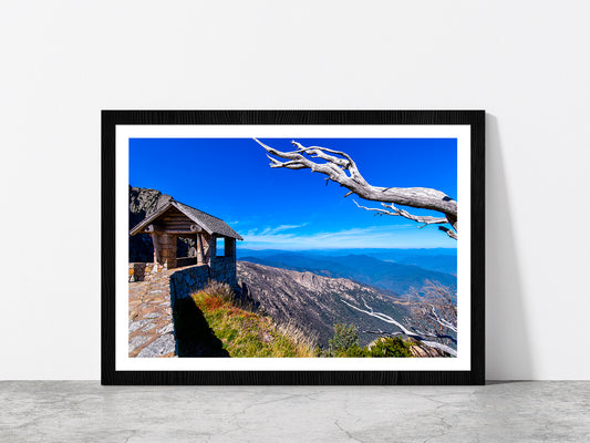 Hut On Top Of Mountain Blue Sky Glass Framed Wall Art, Ready to Hang Quality Print