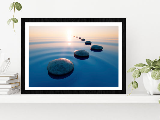 Row Of Stones In Ocean Calm Water Glass Framed Wall Art, Ready to Hang Quality Print