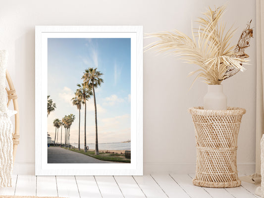 Palm Trees near Beach with Blue Sky Photograph Glass Framed Wall Art, Ready to Hang Quality Print