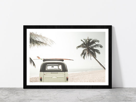 Surf Board on Vintage Van & Palm Tree near Sea Glass Framed Wall Art, Ready to Hang Quality Print