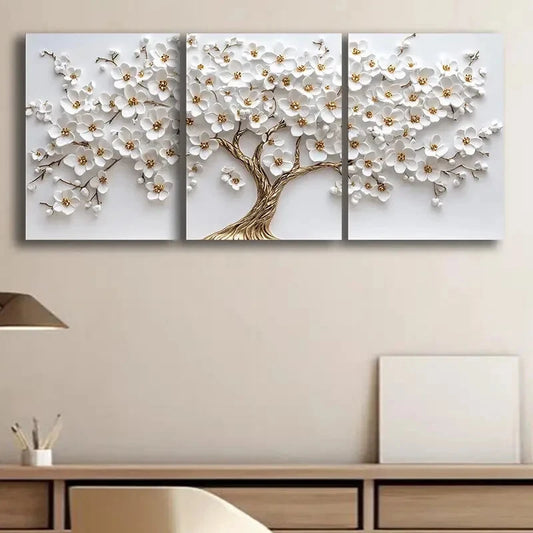 3pcs White Flower Tree Design Metal Print Ready to Hang Art