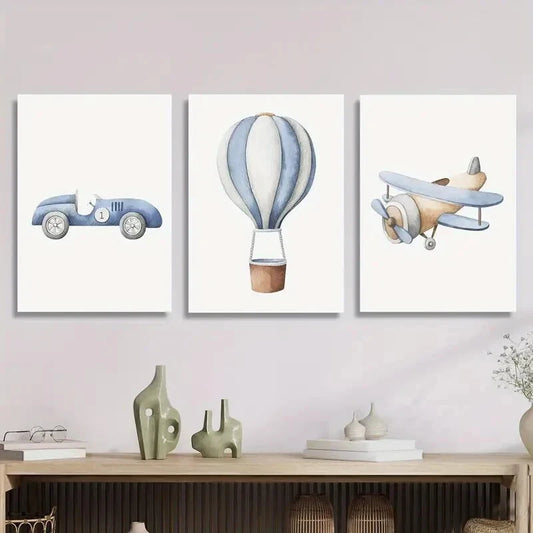 3pcs Cartoon vehicles, cars, hot air balloons Metal Print Ready to Hang Art