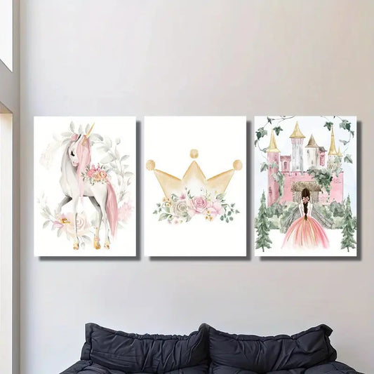 3pcs Pink Unicorn, Floral Castle & Watercolor PrincMetal Print Ready to Hang Art