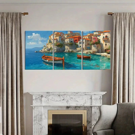 3pcs Artistic Coastal Village Mediterranean Style Metal Print Ready to Hang Art